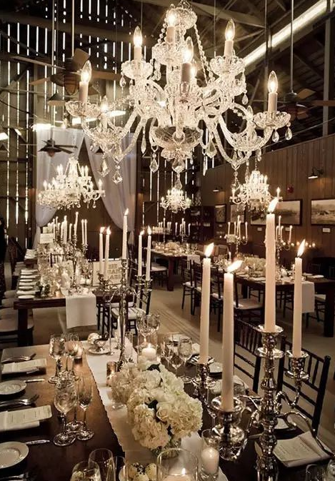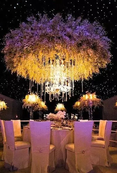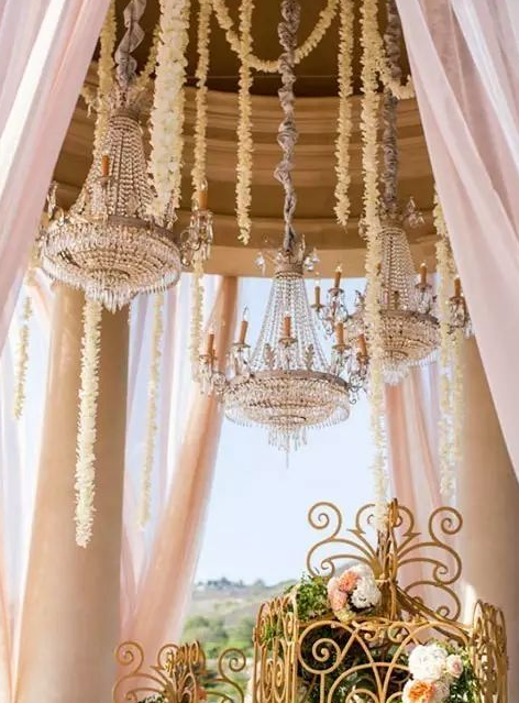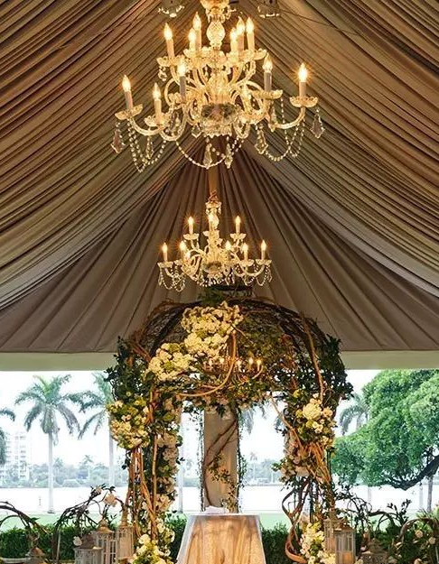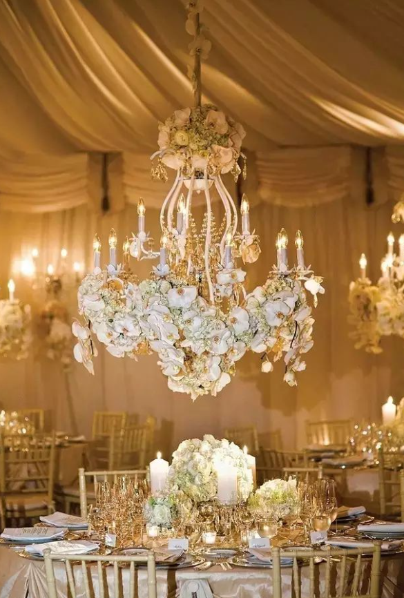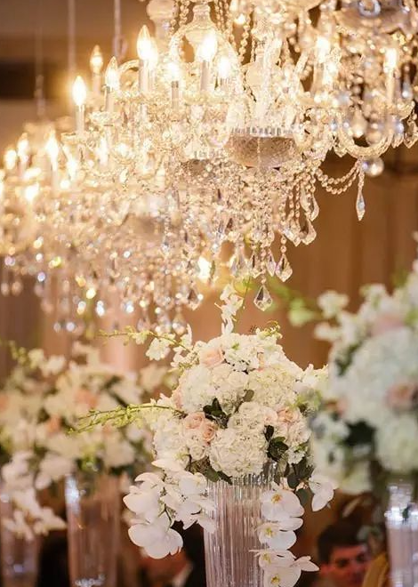 吊灯风格百变,时而富丽堂皇,时而浪漫唯美,时而清新淡雅。搭配帷幔,鲜花绿植,或者珠帘适用于各个场景,展现出不同风格的婚礼所需的点睛元素。它使你的婚礼通明透亮,是婚礼设计中不可忽略的亮点。
